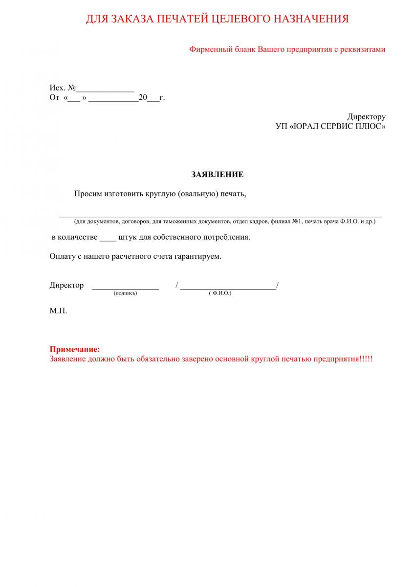 Образец заявления для заказа  печати целевого назначения можно скачать на нашем сайте.