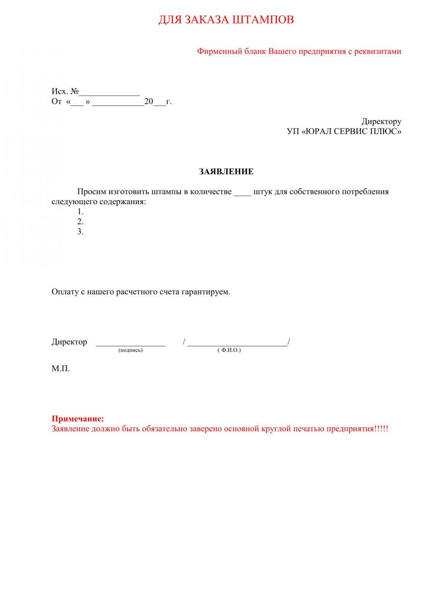Заявление для заказа штампов